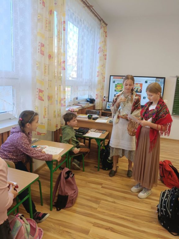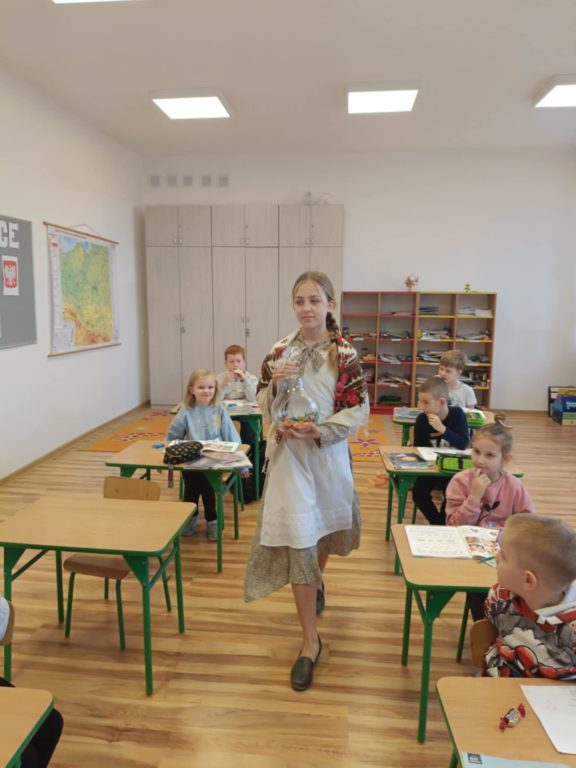 Wycieczka była wspaniałą lekcją na żywo – dzieci mogły nie tylko zobaczyć, ale także dotknąć i samodzielnie wypróbować elementy dawnej kultury wiejskiej. Poznały rodzaje zbóż oraz nazwy tradycyjnych narzędzi, a dzięki zaangażowaniu prowadzących, przeniosły się na chwilę w czasy swoich pradziadków.