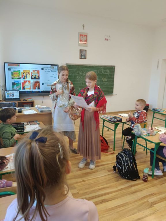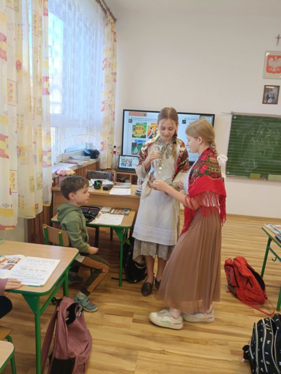Po przyjeździe na miejsce uczestnicy zostali serdecznie powitani przez pracowników skansenu, którzy przygotowali humorystyczną scenkę w gwarze – już na początku nie brakowało śmiechu i dobrej zabawy.