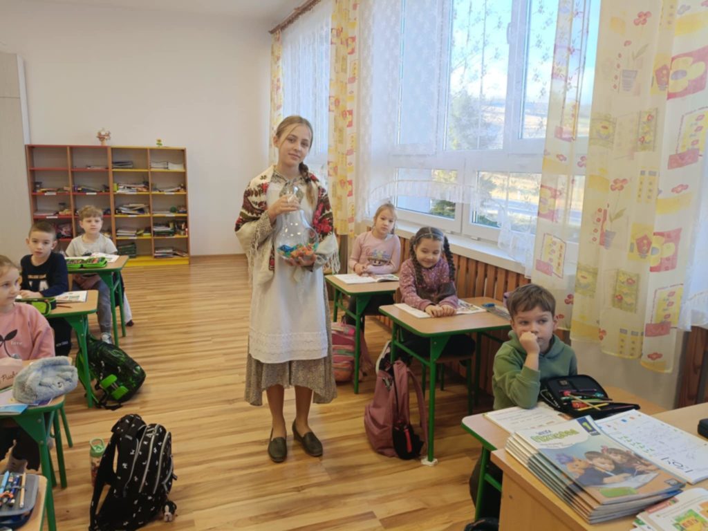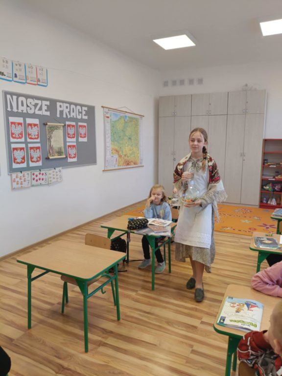 Niespodzianką przygotowaną dla klas I- III były odwiedziny Patronki, w którą wcieliła się uczennica klasy VII- Maria Obrzut. Przybyła do uczniów w towarzystwie koleżanki (Zuzanna Trojan) i przeprowadziła krótki quiz wiedzy o Bł. Karolinie. W każdej klasie wyłoniono zwycięzców i nagrodzono ich słodyczami.