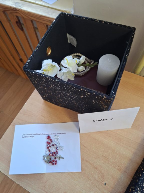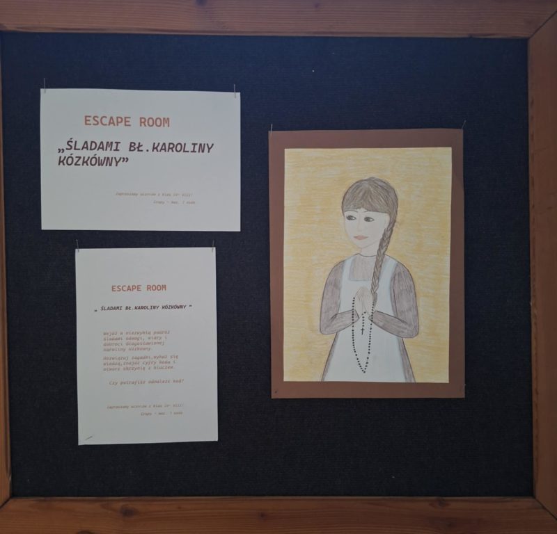Uczniom z klas od IV do VIII, podzielonym na 7-osobowe grupy, zaproponowano wizytę w escape roomie, czyli pokoju zagadek zatytułowanym „Śladami Bł. Karoliny Kózkówny”. Uczestnicy zamknięci w tematycznym pomieszczeniu musieli rozwiązać 4 zagadki poświęcone patronce szkoły, by zdobyć czterocyfrowy kod do kłódki i wydostać się z klasy.