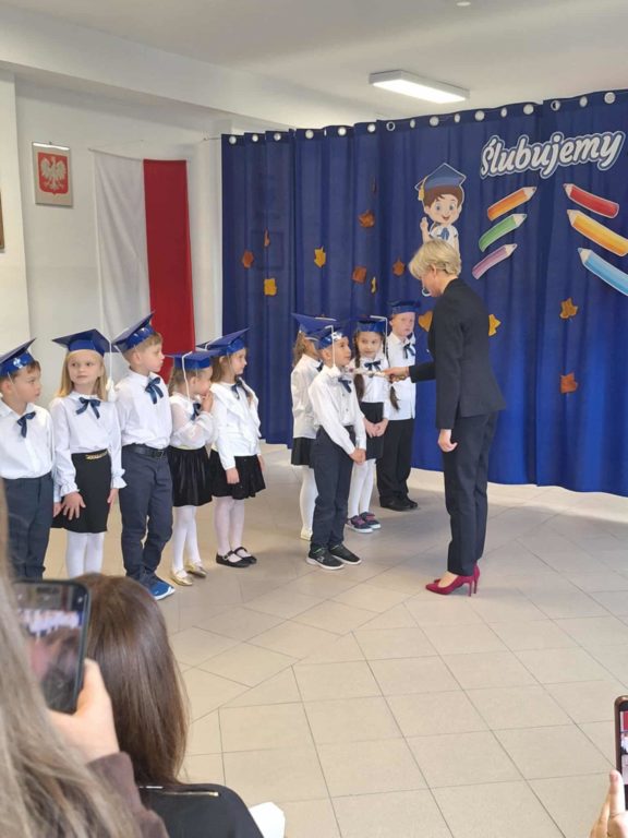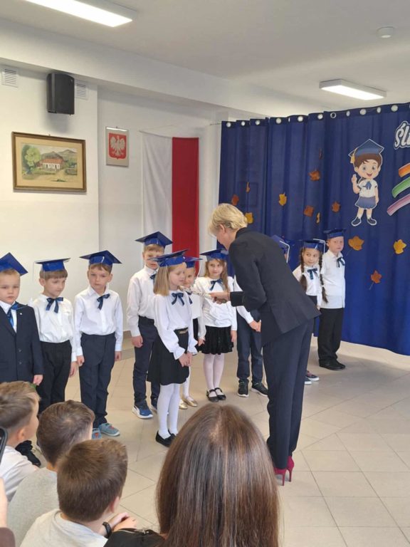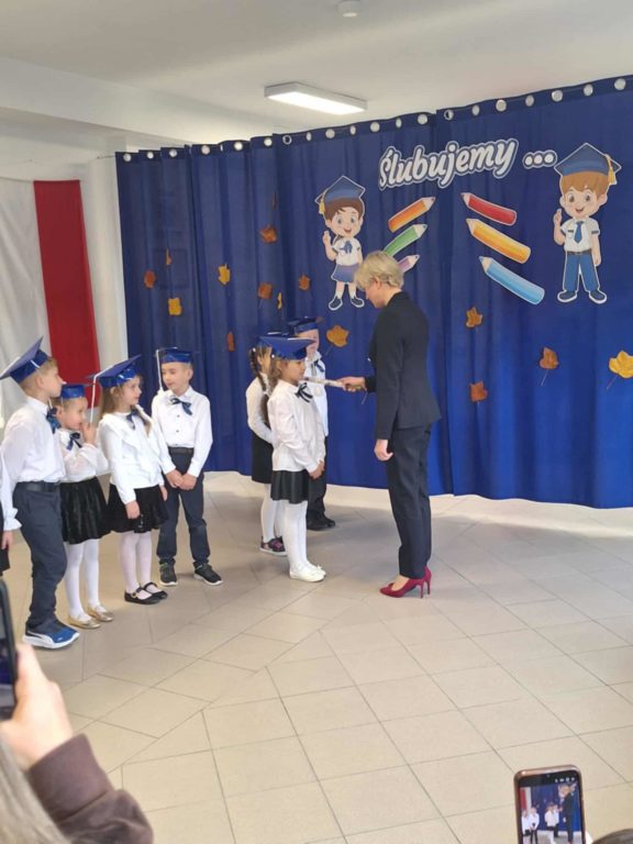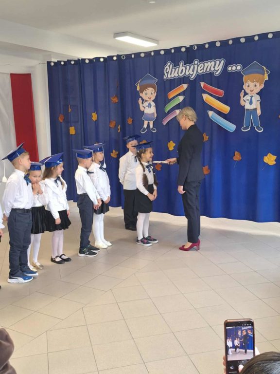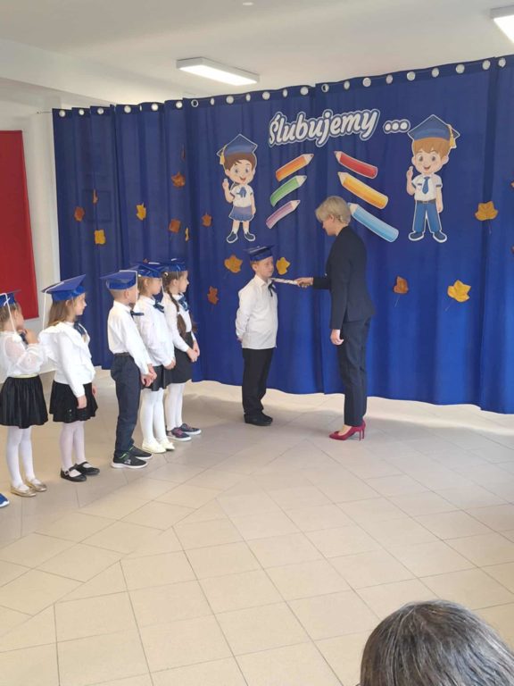 Najważniejszym momentem było pasowanie na ucznia, którego dokonała Pani Dyrektor. Każdy pierwszoklasista otrzymał legitymację szkolną i pamiątkowy dyplom. Na zakończenie uroczystości głos zabrali zaproszeni goście, kierując do dzieci serdeczne gratulacje i życzenia sukcesów w nauce.