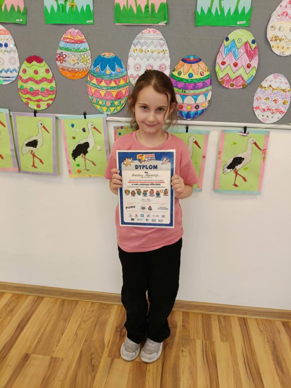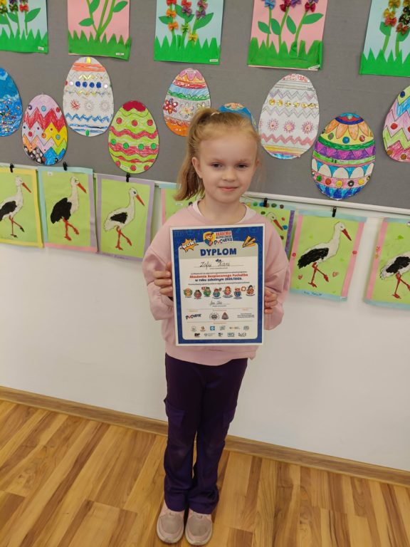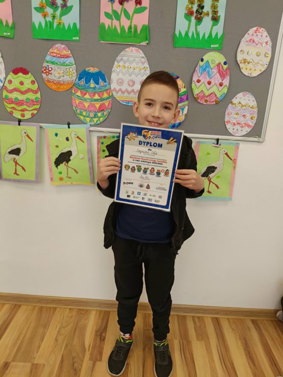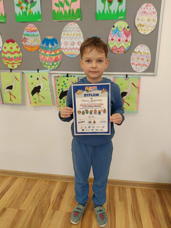 Na zakończenie programu uczniowie samodzielnie rozwiązali test wiedzy, sprawdzający zdobyte wiadomości i umiejętności. Dzieci z dużym zaangażowaniem podeszły do zadania, wykazując się bardzo dobrą znajomością omawianych zasad bezpieczeństwa. Na pamiątkę udziału w programie uczniowie otrzymali dyplomy wręczone przez dyrektora szkoły Panią Katarzynę Cudejko. Szkoła natomiast uzyskała certyfikat potwierdzający udział w programie „Akademia Bezpiecznego Puchatka”.
