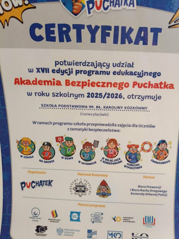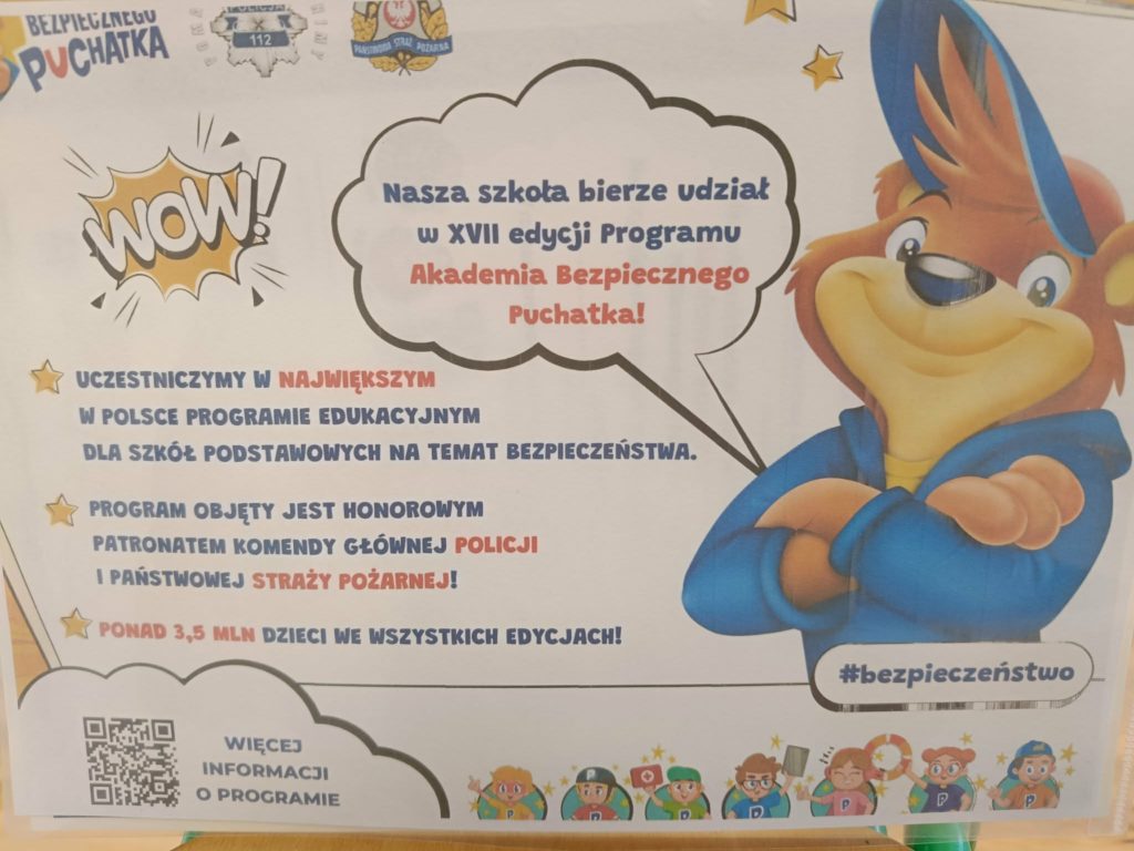 Uczniowie klasy I naszej szkoły pod kierunkiem wychowawcy w bieżącym roku szkolnym wzięli udział w Ogólnopolskim Programie Edukacyjnym ,,Akademia Bezpiecznego Puchatka”, którego celem jest kształtowanie u najmłodszych uczniów właściwych nawyków związanych z bezpieczeństwem w różnych sytuacjach życia codziennego.