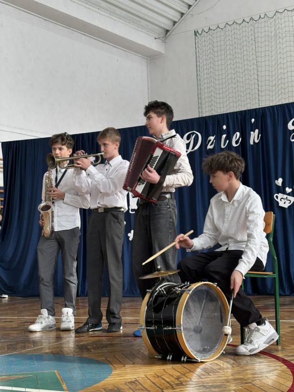 Następnie odbyło się wspólne kolędowanie, podczas którego na instrumentach zagrało czterech uczniów klasy VIII ( Adrian Wolak- akordeon, Filip Janiczek- trąbka, Bartłomiej Włudyka- saksofon, Mikołaj Frączek- perkusja). Do śpiewu bardzo chętnie dołączyli wszyscy obecni na uroczystości , tworząc wyjątkową, ciepłą i radosną atmosferę, pełną świątecznego ducha.